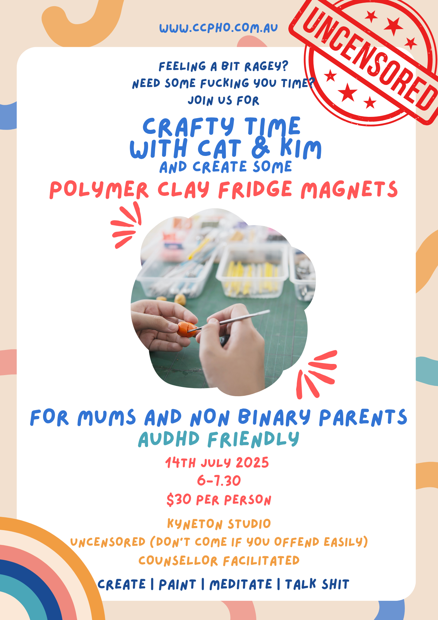Bring your best, most authentic self and make connections with other like minded mothers and non binary parents. We will talk shit, create some polymer clay fridge magnets (totally doesn't matter if they're a bit dodgy!), paint our creations if needed, do some meditation, share our rage stories, and just get some quality 'me time'.